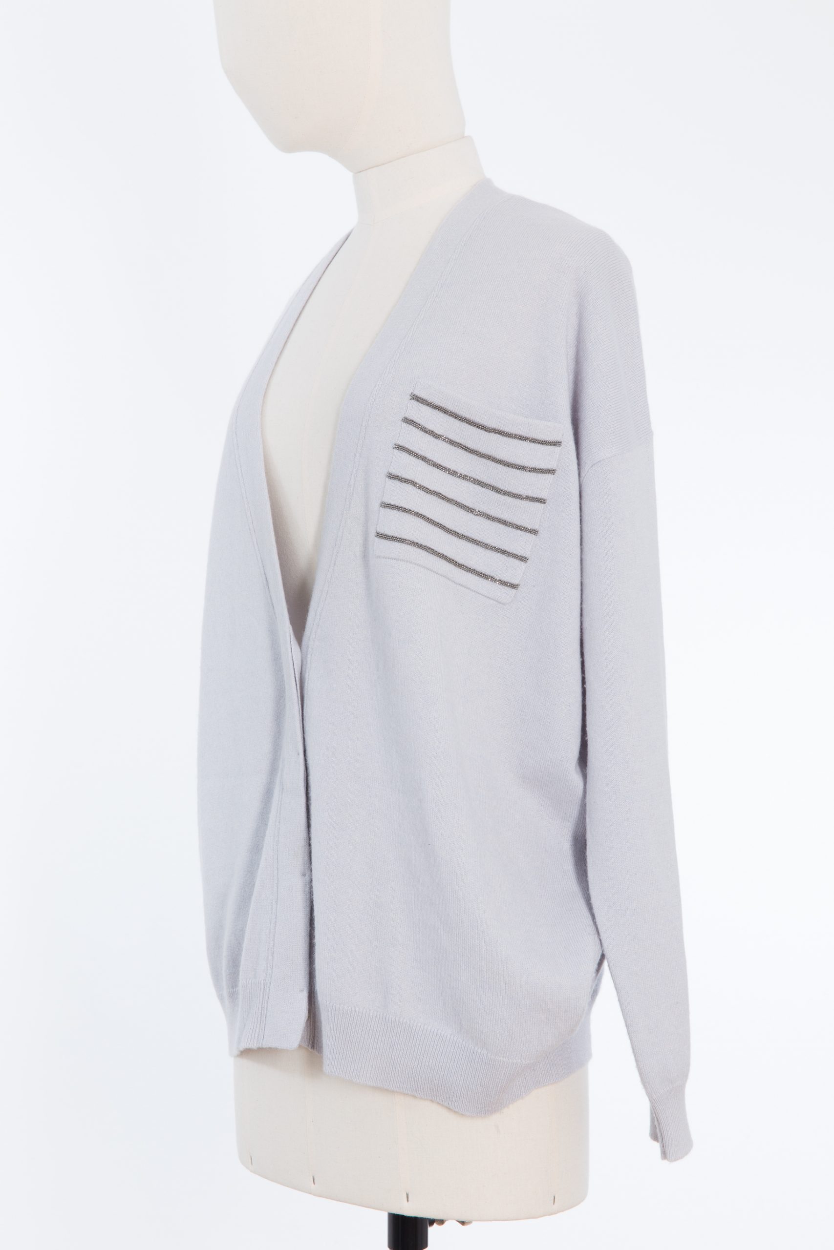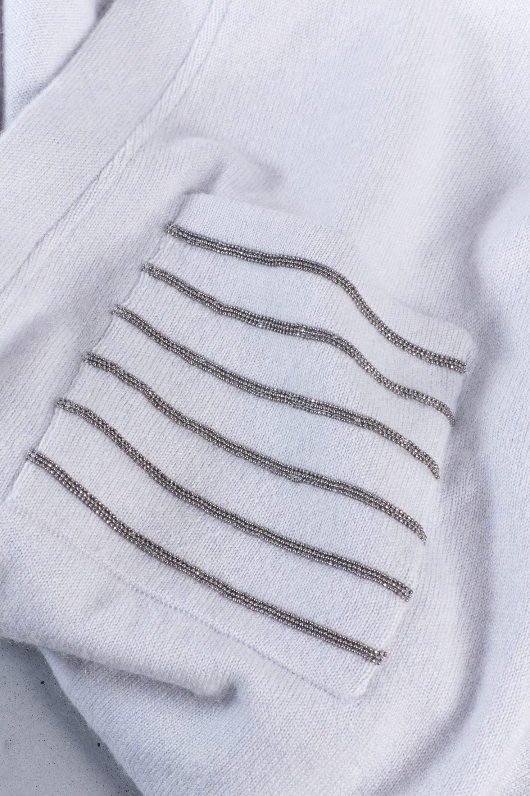 The timeless design of this pure cashmere Brunello Cucinelli sweater is paired with casual details that are updated in a shiny way. Precious sparkling monili stripes run across the chest pocket. The soft silhouette and slightly dropped shoulders define the comfortable, relaxed fit.