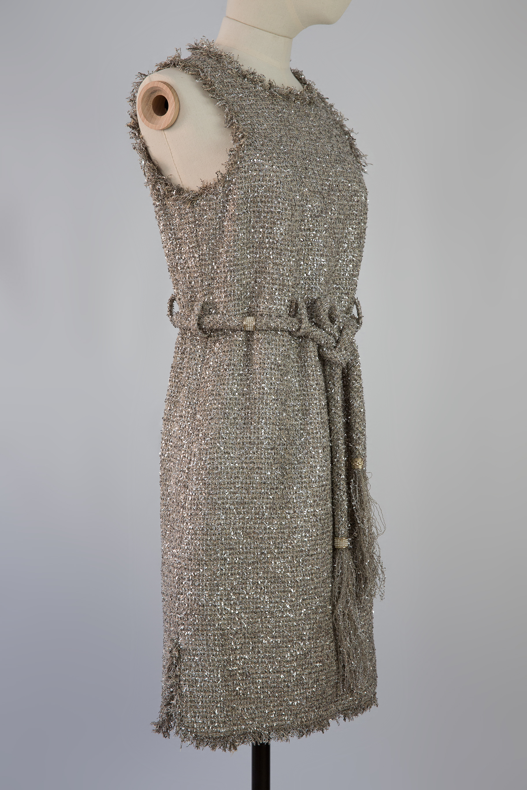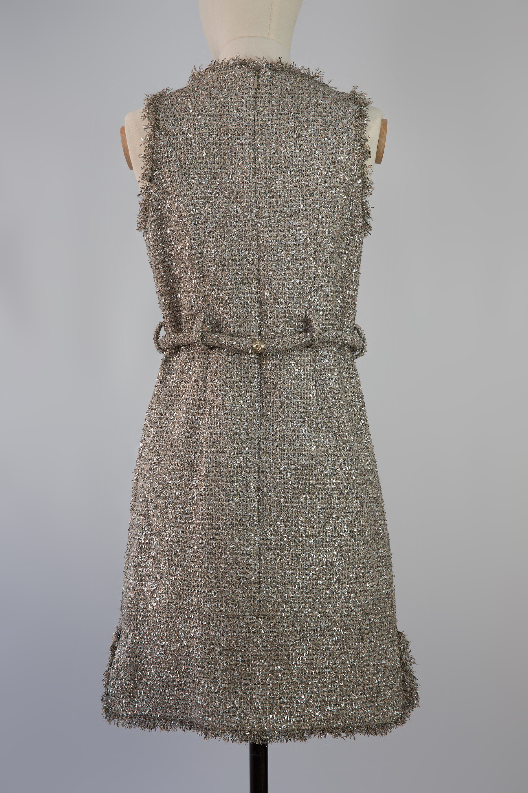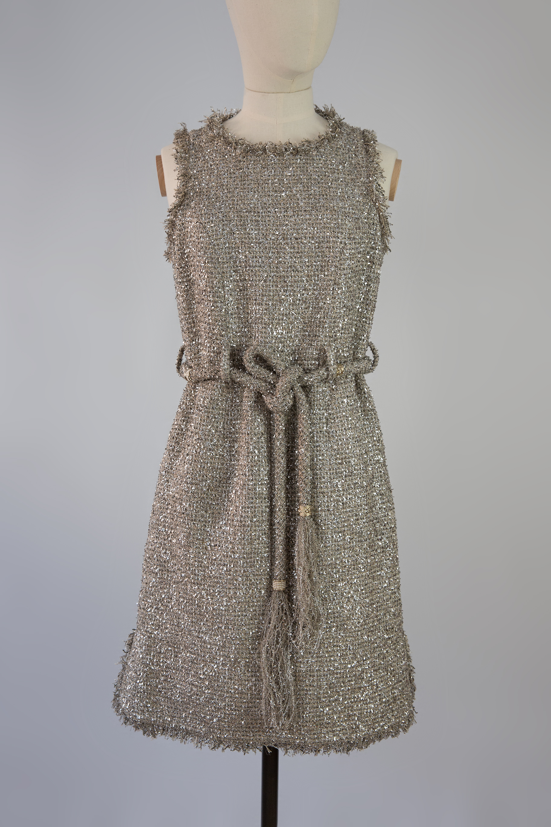 Chanel Paris Greece metallic tweed sleeveless dress features fringe trim, hidden pockets (still sealed), interlocking CC embellished sash tie belt at waist, and a back hidden zip closure. This dress is one of a kind, it was impossible to find in the boutique especially in the small size as this one. Reveal your inner goddess.