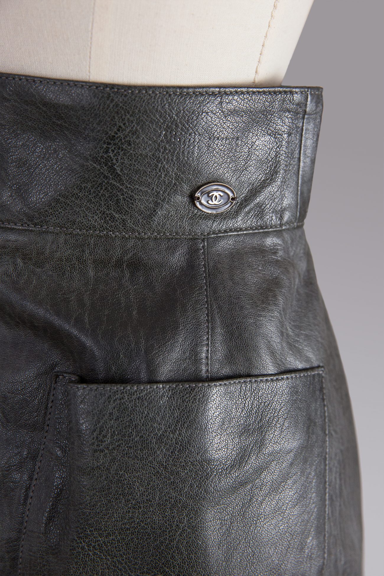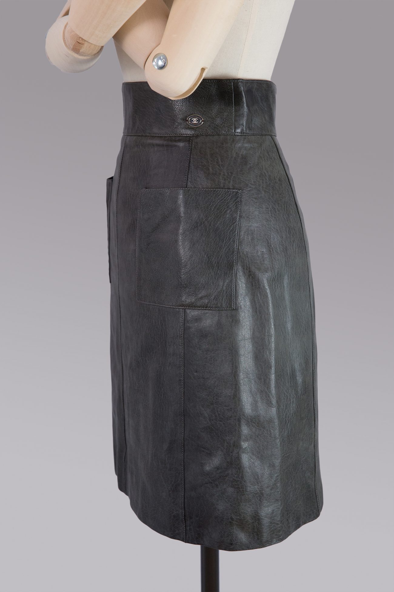 Every well-curated wardrobe requires a leather skirt, and this iteration from Chanel is the perfect option. Made from aged effect grey lambskin leather, the design starts at a high, banded waist and falls into an a-line silhouette. Two flap pockets and Chanel logo button decorate the skirt. Make yours part of a daring office ensemble or make it the focal point of a Saturday evening look.