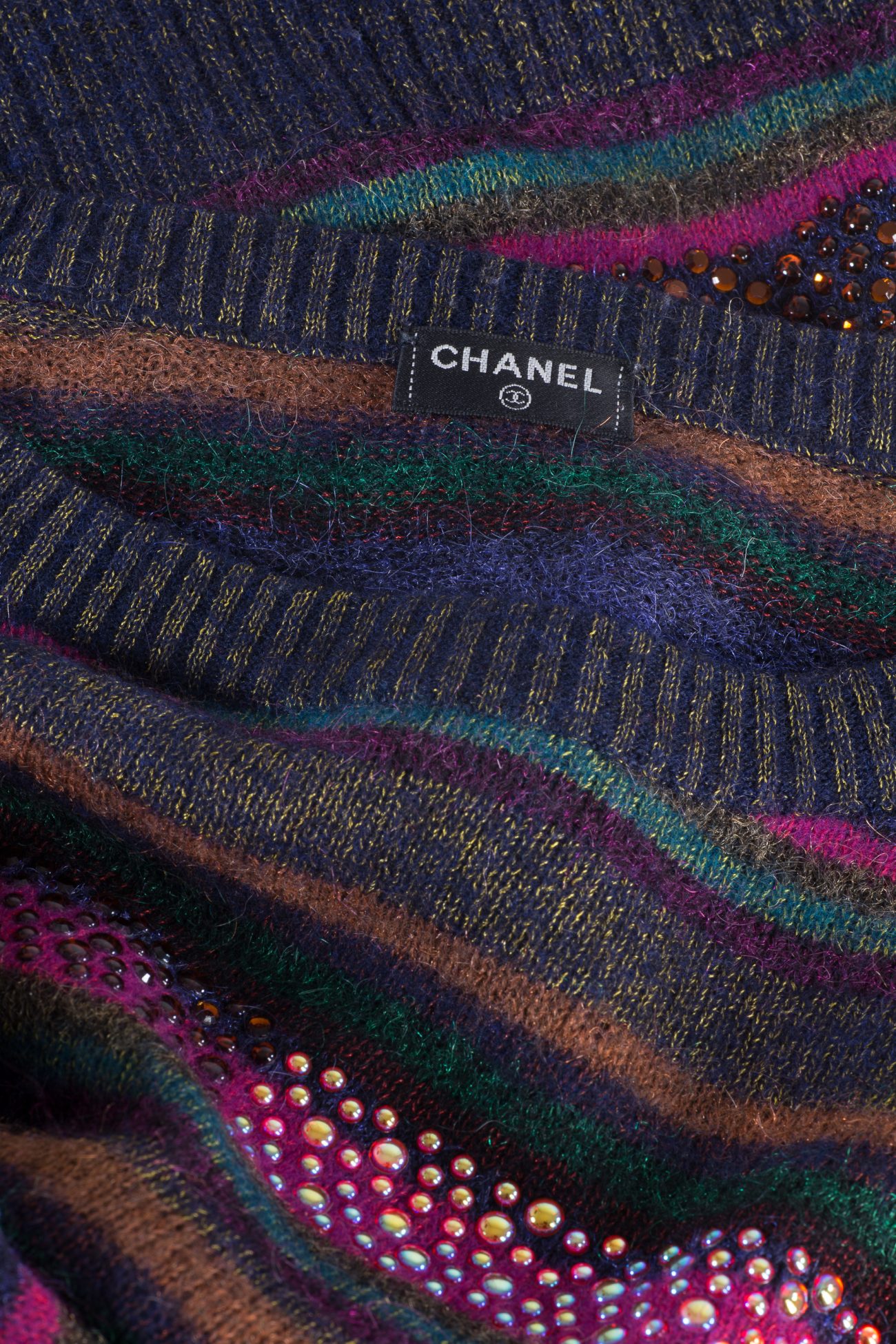 Chanel creates exceptional ready-to-wear pieces that become instant classics. This sweater from Fall 2012 collection is a great example of house’s expertise. Vibrant piece with shimmer effect made of soft wool and mohair blend featuring metallic threads throughout and crystals forming beautiful color block pattern.