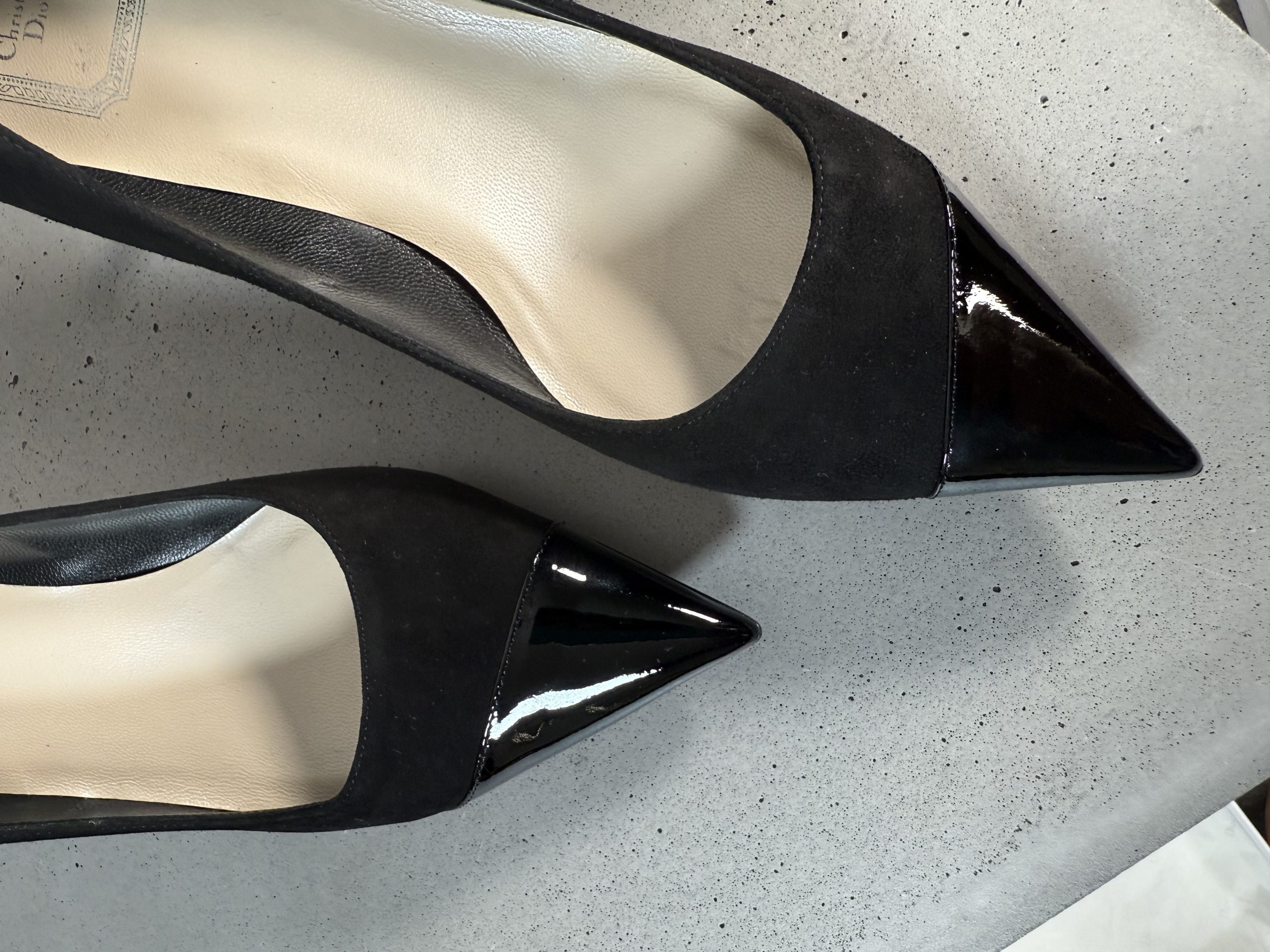 These Christian Dior flats are the definition of timeless elegance. The body of the shoe is crafted from the softest suede, while the pointed toe in glossy patent leather adds a refined, feminine accent. A discreet 0.5 cm heel makes them the perfect choice for long days at the office-comfortable enough to wear from morning to evening, yet polished for every occasion.