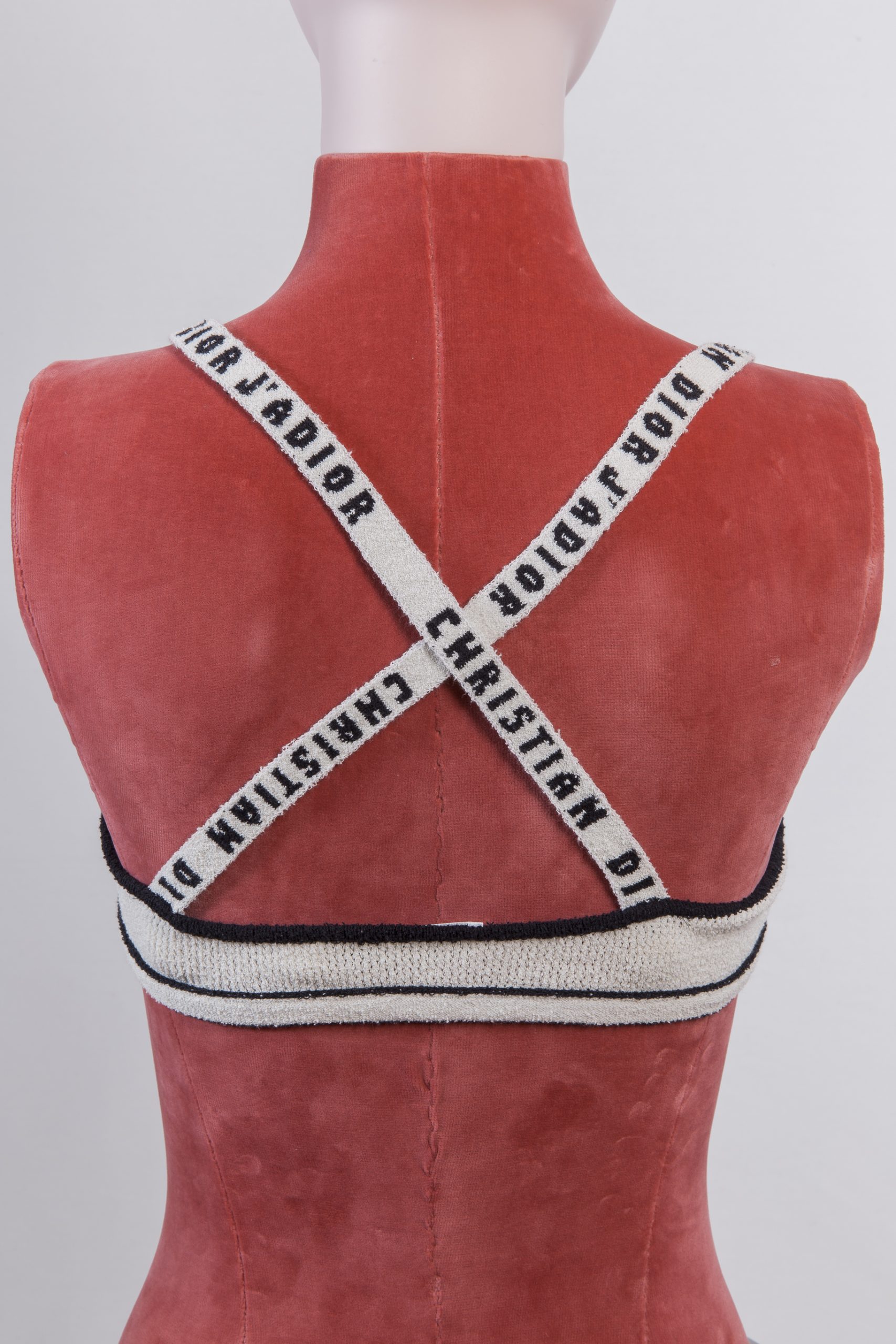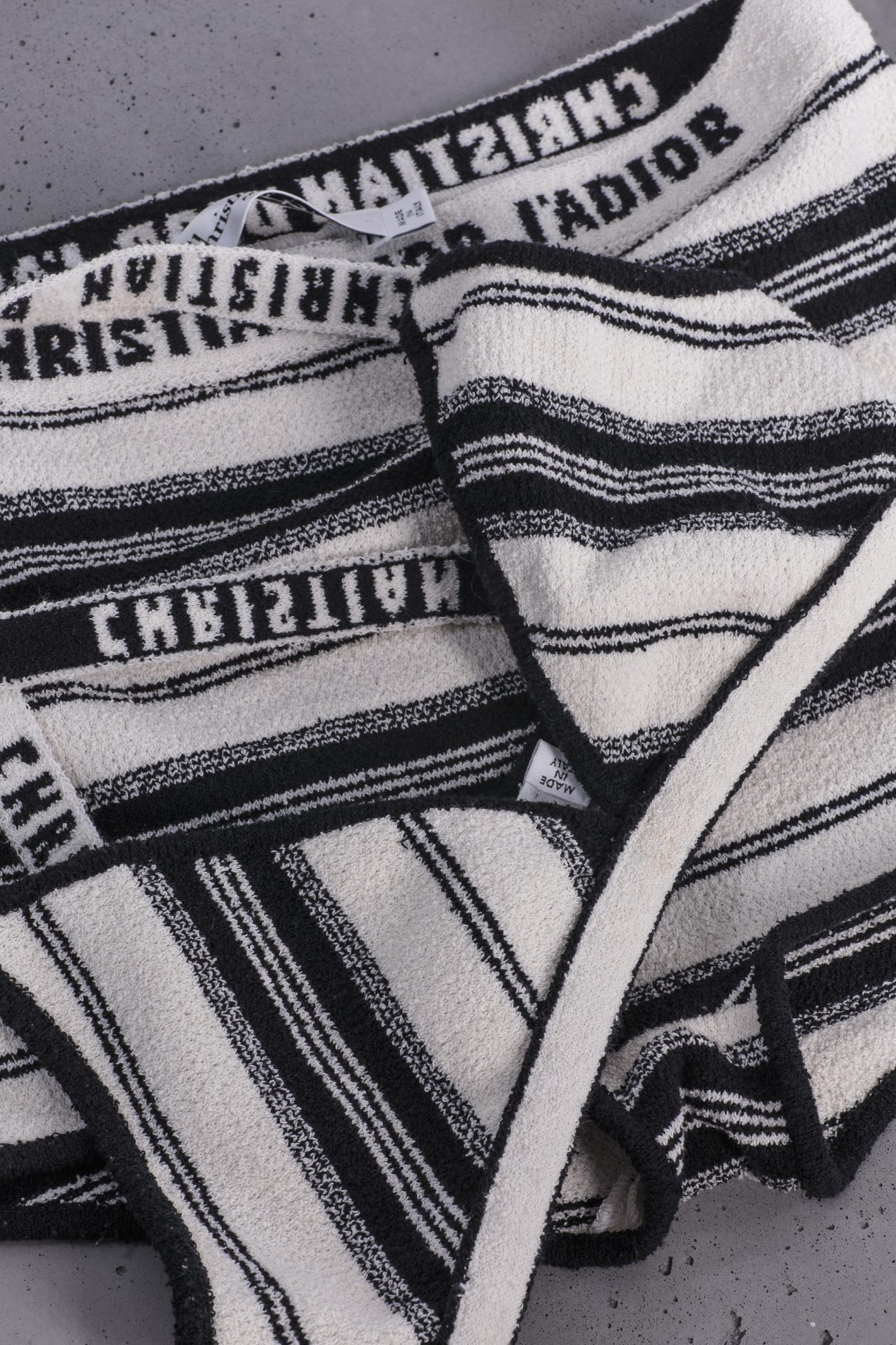 This Dior Bra became a house signature and being introduced by Maria Grazia Chiuri season after season. This black and white striped version is crafted in soft stretch cotton blend. Inspired by the spirit of farniente, the bra is styled with a triangle cut. The crisscross back straps feature a bold 'Christian Dior' signature. This versatile top can be worn under a sheer blouse, as seen on the runway. Complete the look with a matching briefs.