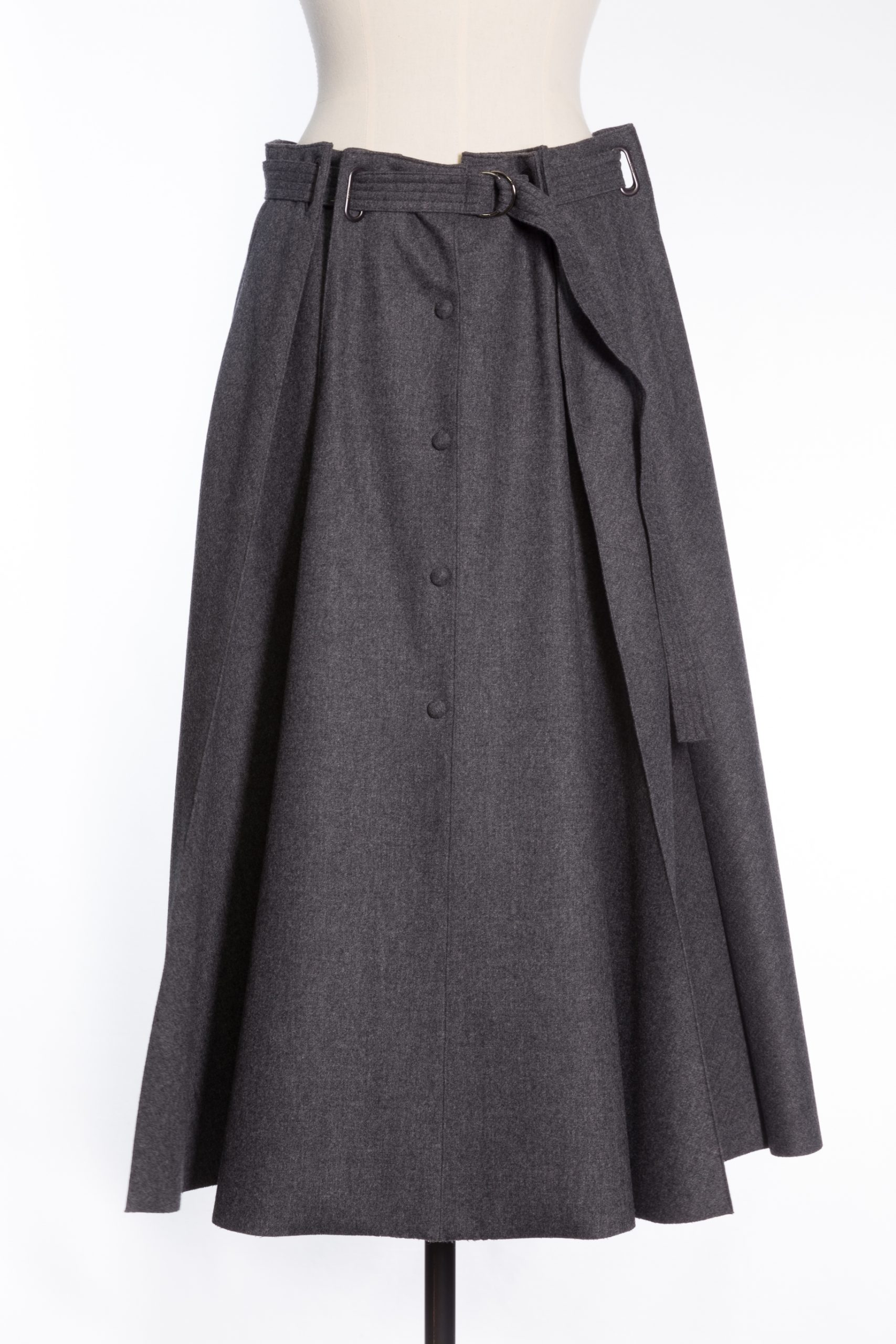 Fendi's grey midi skirt is crafted from fleece wool. It's made in Italy with wide front and back knife pleats. Adjustable belts for the convenience. Add a sweater and knee-high boots for a sophisticated guise.
