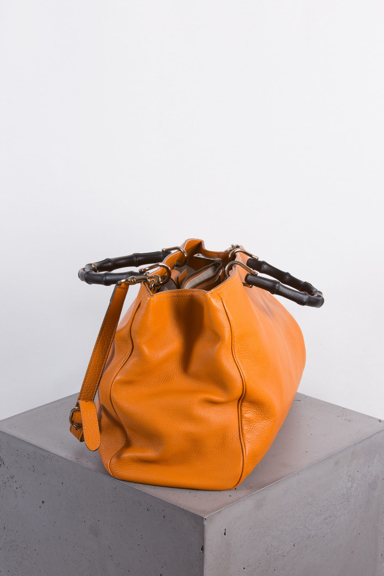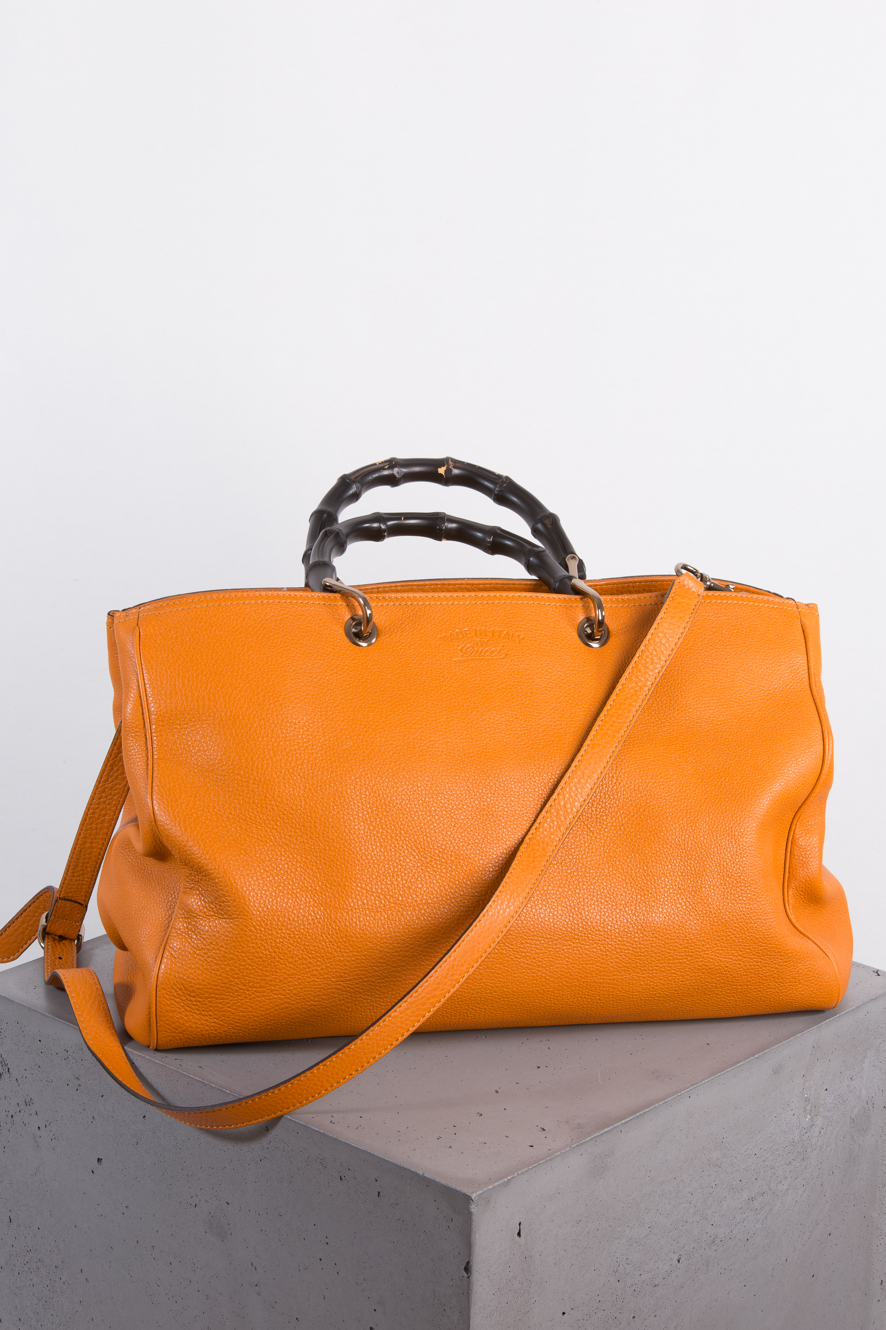 Gucci uses a patented method to heat and bend the bamboo handles on its iconic bags. This textured-leather tote in a large size is crafted of beautifully textured leather in bright orange. It is fitted with large internal compartments and a designer stamp at the front. Attach the optional strap to carry it over your shoulder. Perfect bag for a everyday use with sophisticated Gucci design.