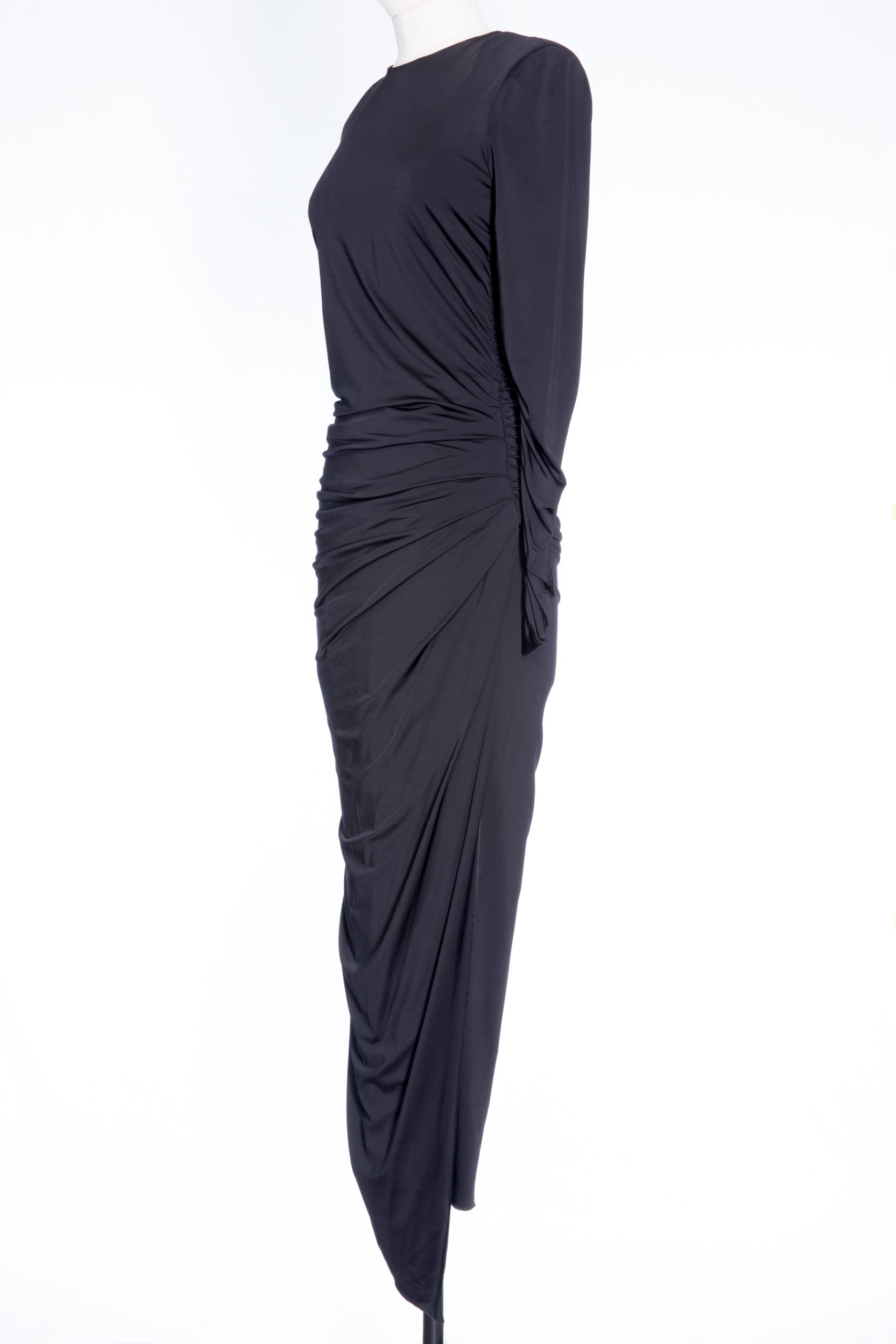 The evening wear universe continues to be explored, from styles infused with House codes to extravagant silhouettes with glamorous details. This long dress is crafted from black satin and comes to life through long sleeves and neck fit.