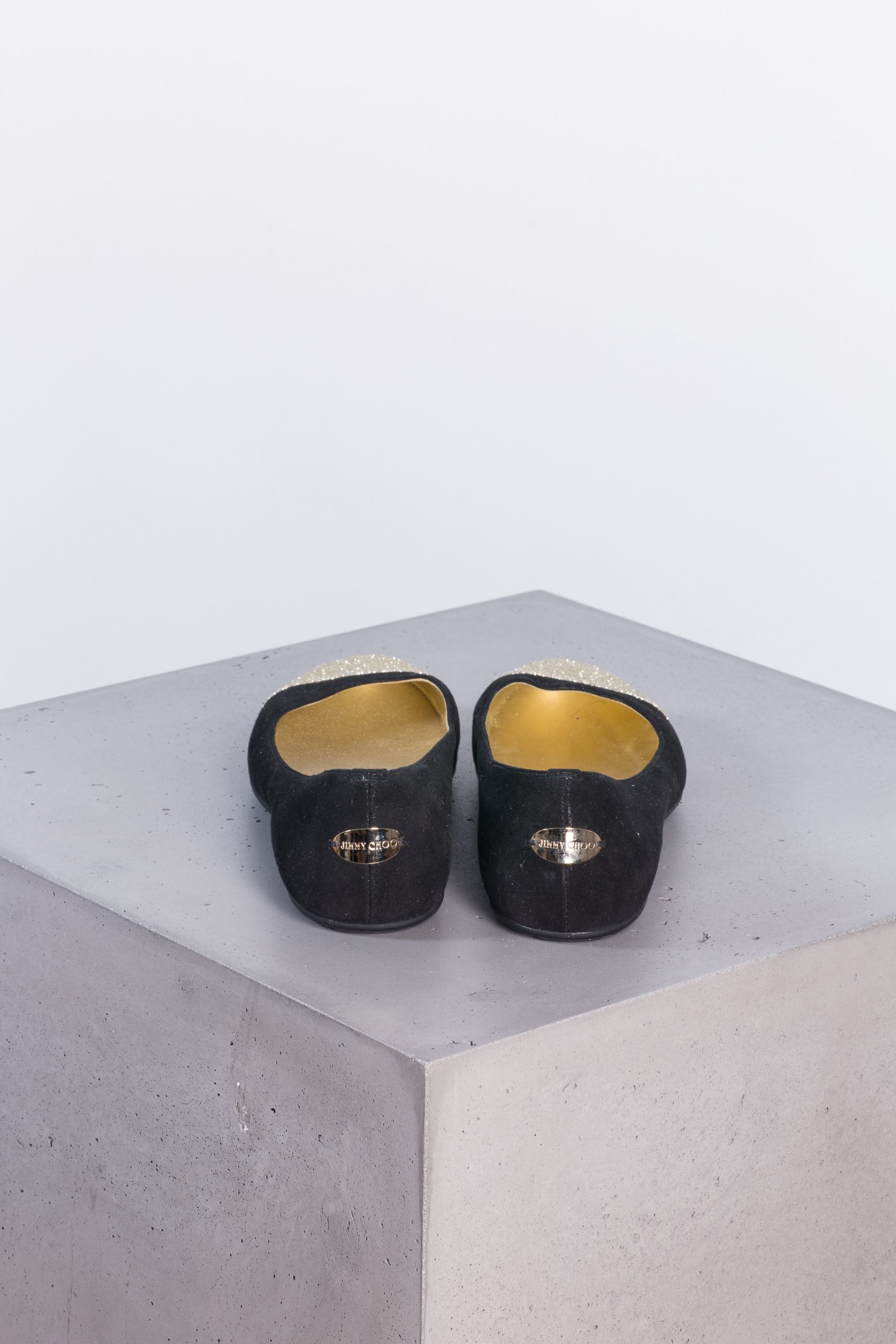 Jimmy Choo's ballet flats are comfortable and versatile. Crafted from supple black suede, this elegant pair feature glittered classic round toe. Wear them at the office or at the weekend.