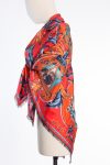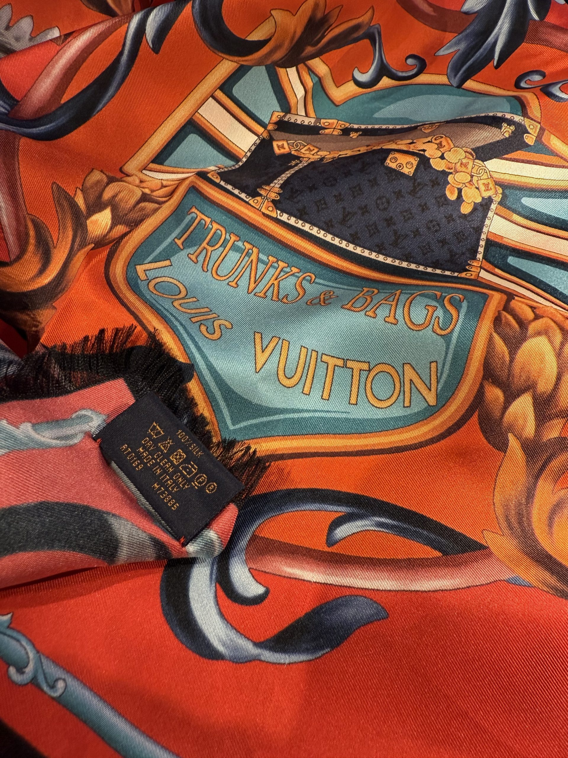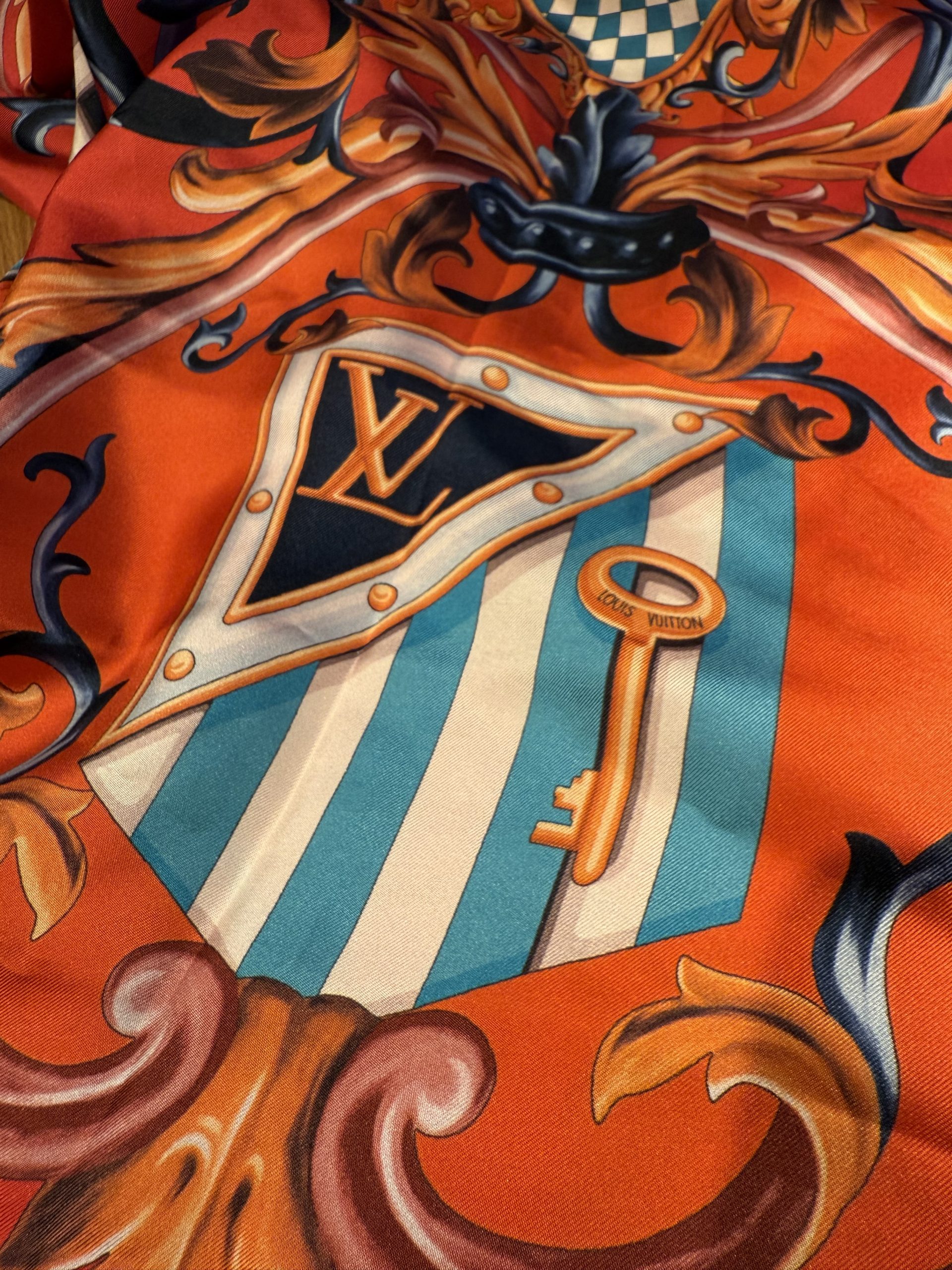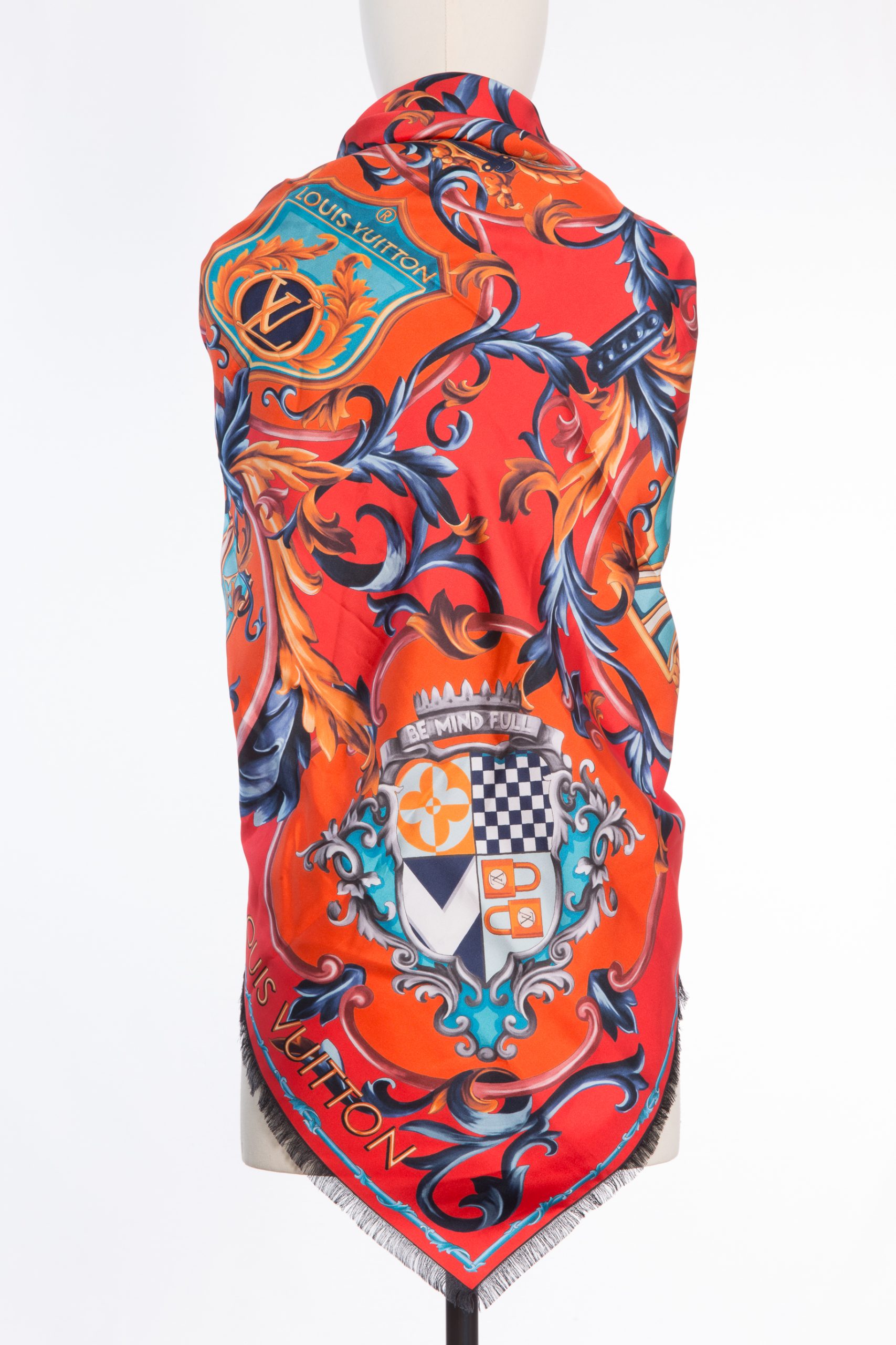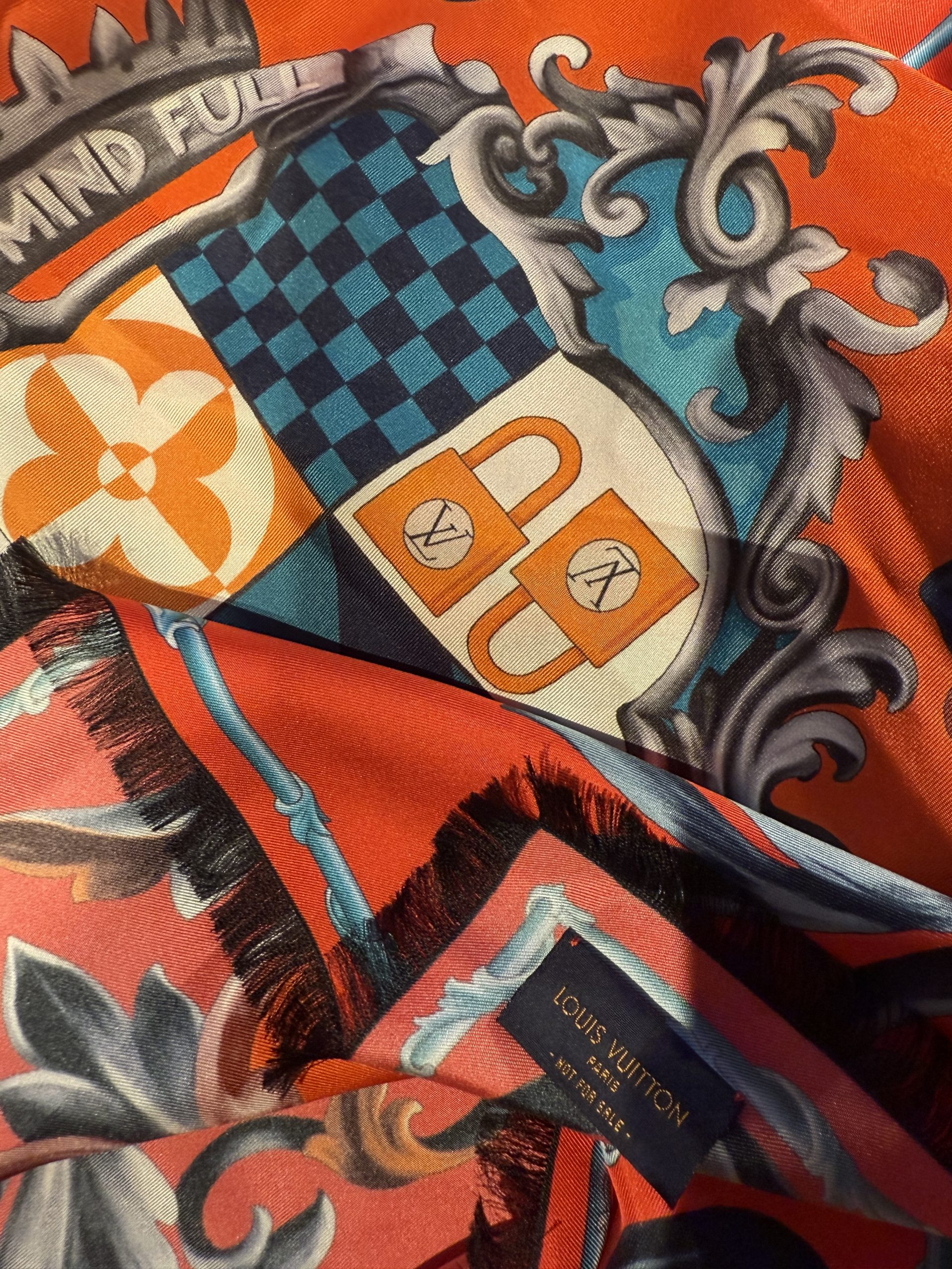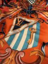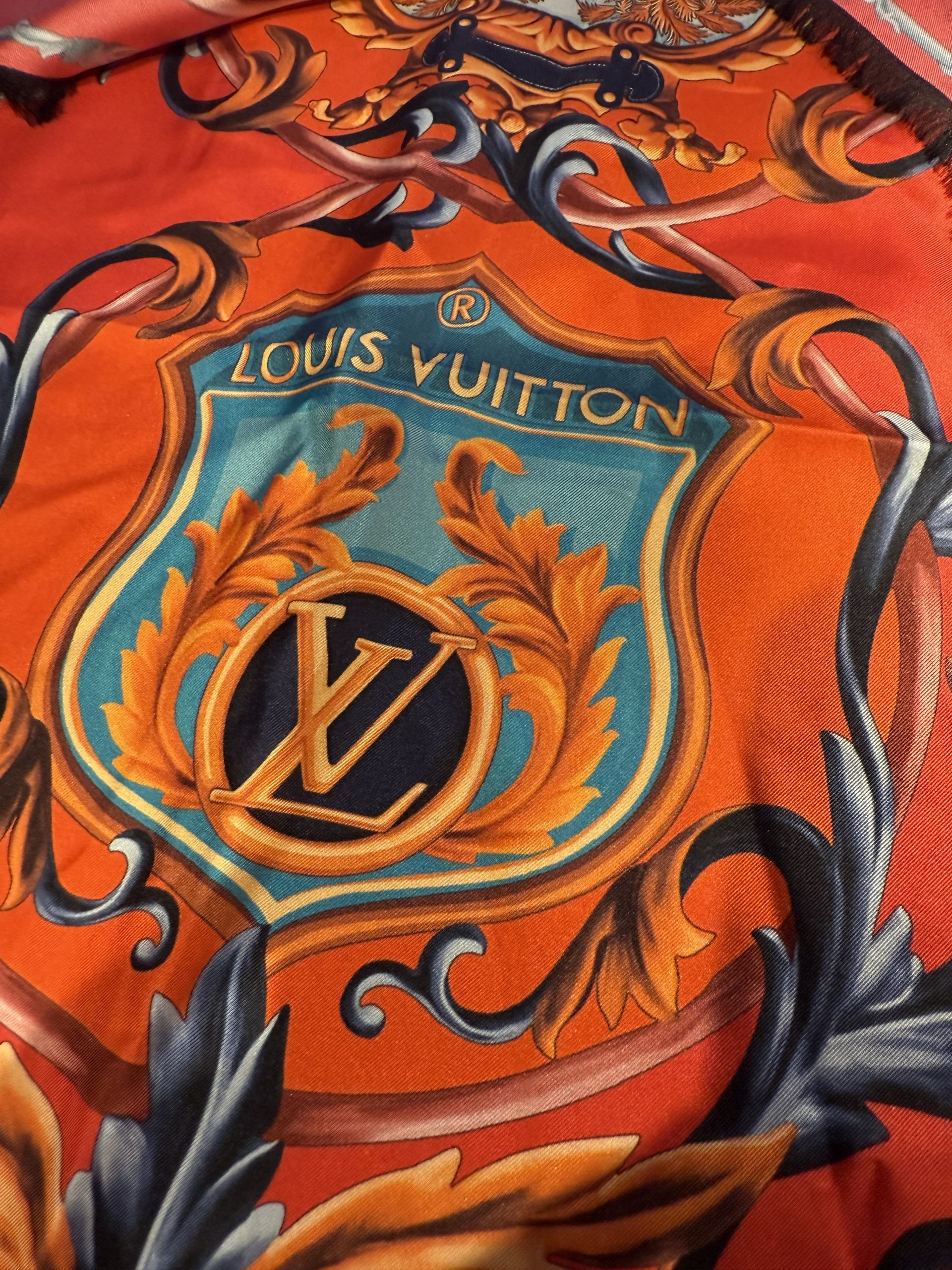 This luxurious Louis Vuitton scarf comes in a rare, richly saturated brick-red shade and features an expressive pattern inspired by crests and stylized hearts. Inside each emblem are the iconic LV logos and the inscription “Louis Vuitton Paris,” making the design instantly recognizable, elevated, and unmistakably signature.