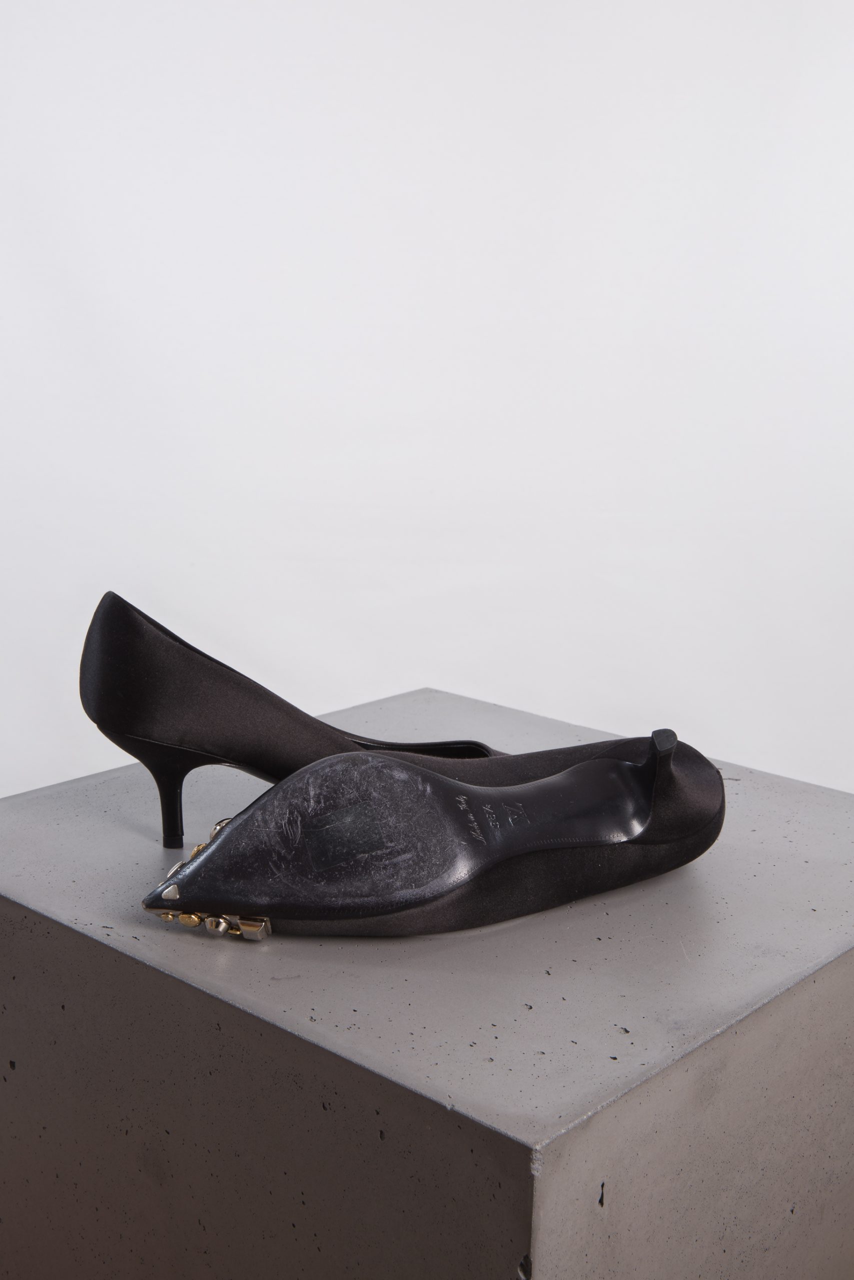 Louis Vuitton's 'Bernice' pumps have been expertly crafted from black satin and rest on a neat 50 mm kitten heel that’s ideal for every day wear. The pair features silver and gold studs at the pointed toe. Show them off with everything from cropped jeans to midi dresses.