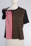 A staple short-sleeved t-shirt elevated with statement details and a signature print. In an asymmetric, bicolor graphic, the iconic Louis Vuitton Monogram motif contrasts with an vertical red and white stripes. An embossed leather buckle gathers one shoulder, creating a draped asymmetrical effect. Comfortable and confident.