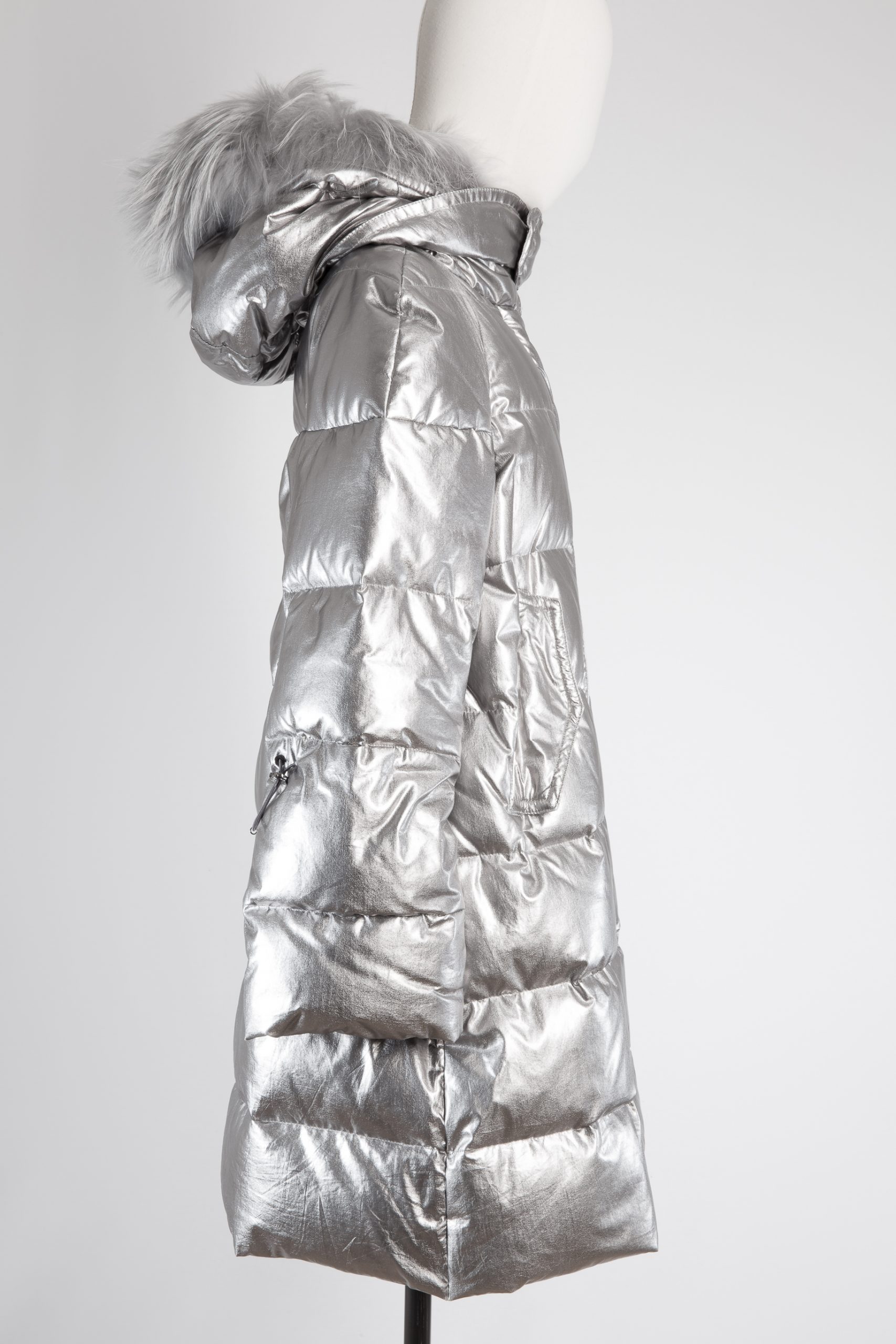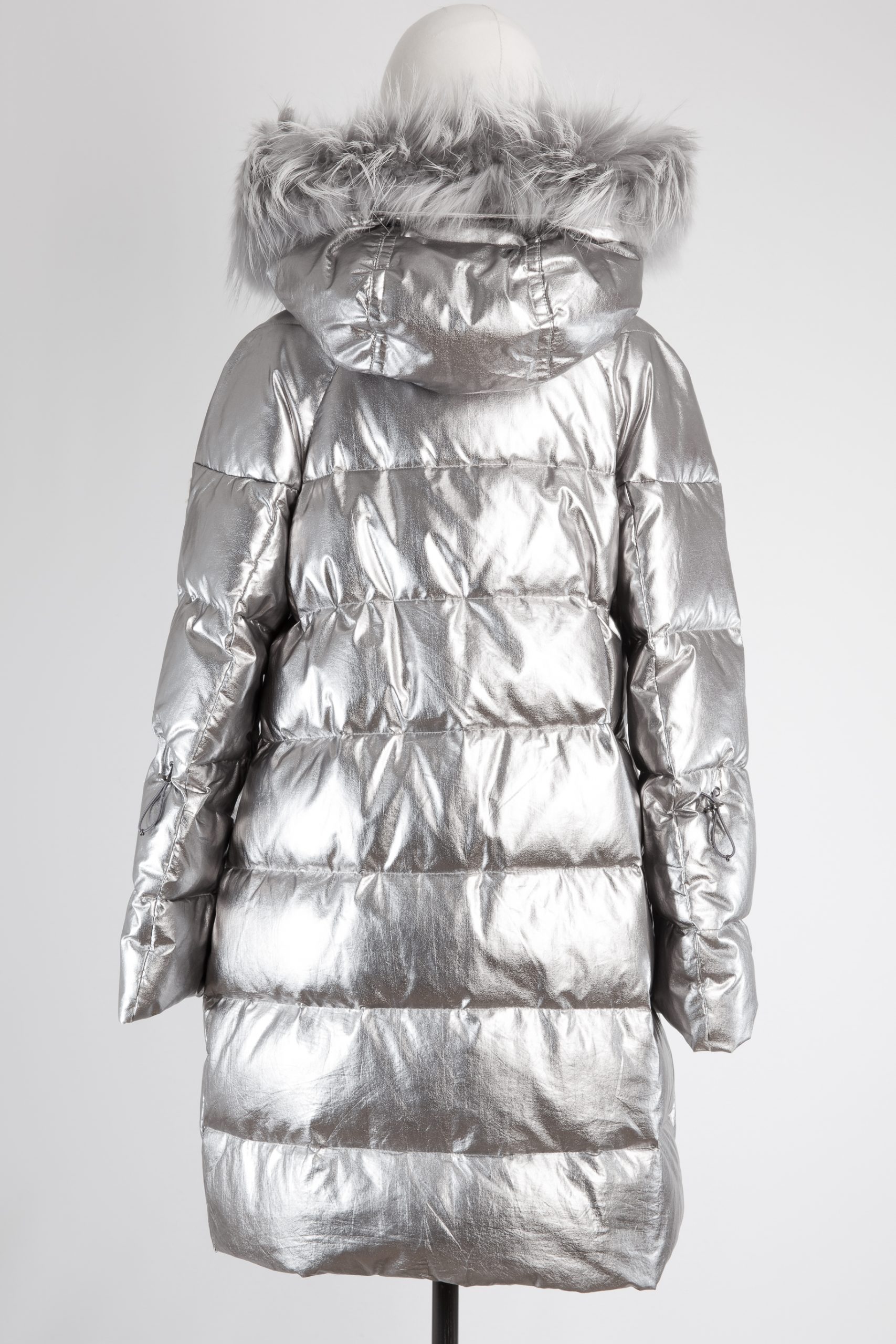 Fur-trimmed metallic quilted down jacket