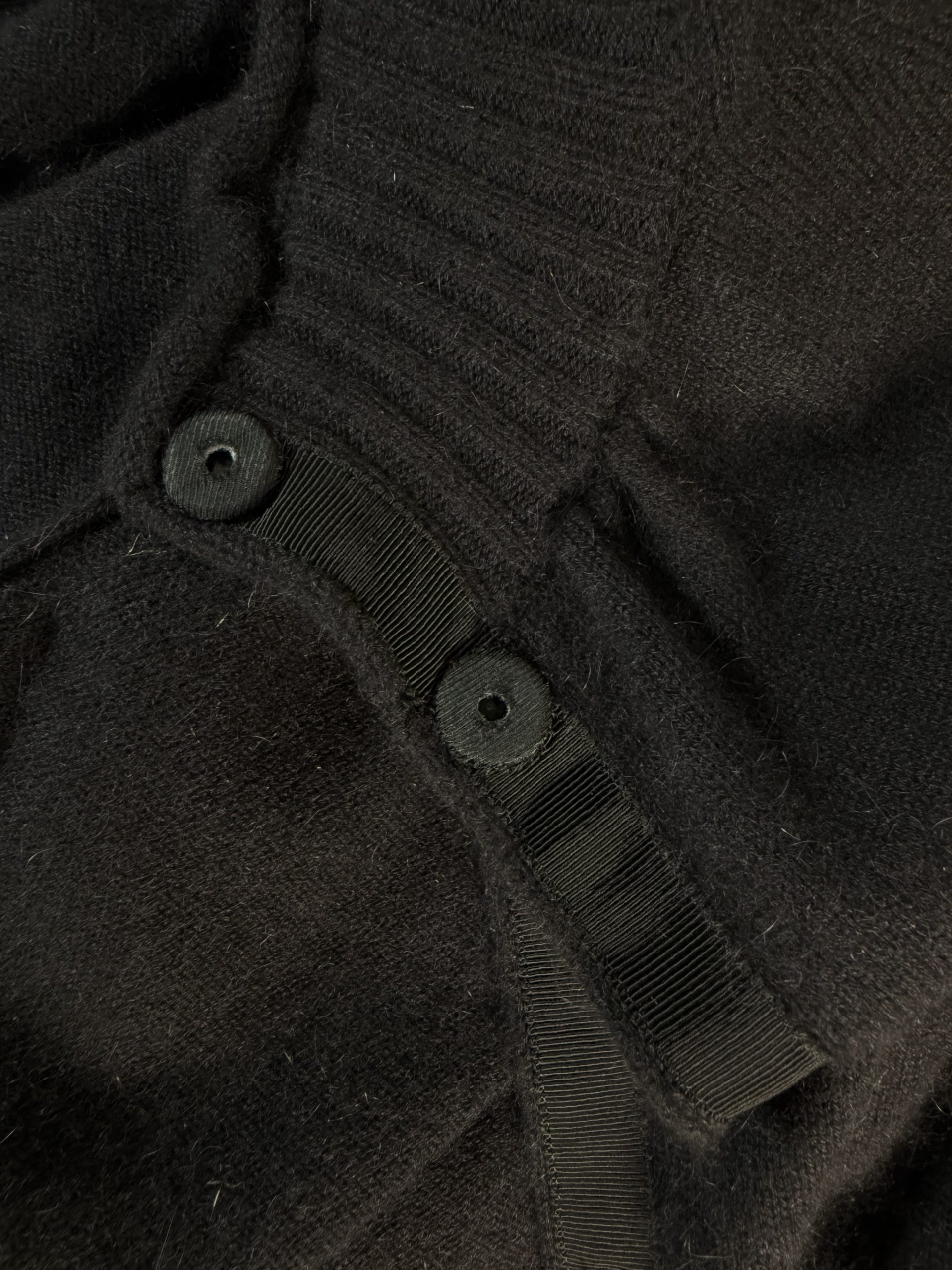 The design features a stand collar with a subtly different knit texture, six concealed snap buttons, and a matching self-tie belt that gently defines the waist, creating a graceful, feminine silhouette. The black hue adds timeless versatility, making it equally suited for office settings, evening outings, or even a night at the opera.