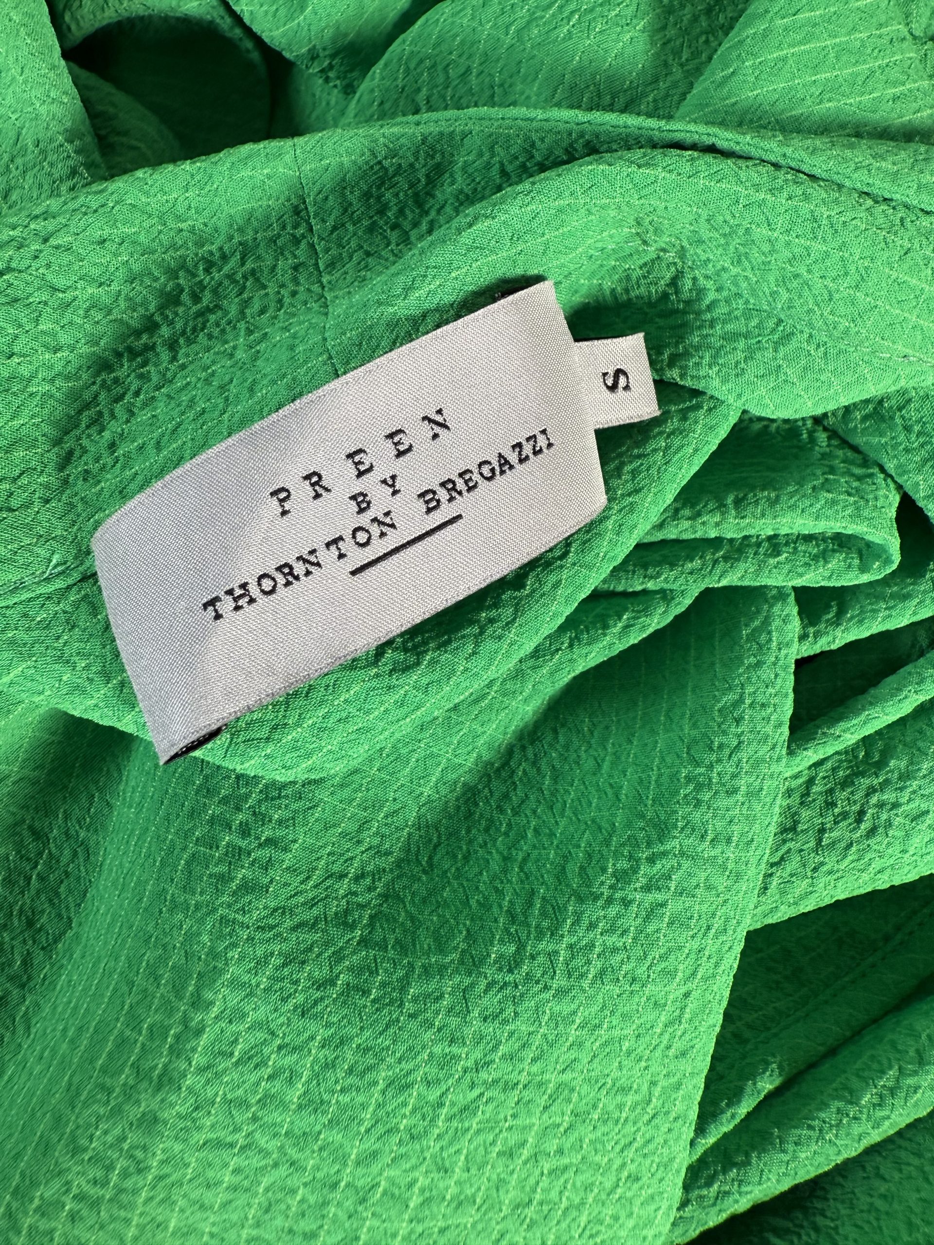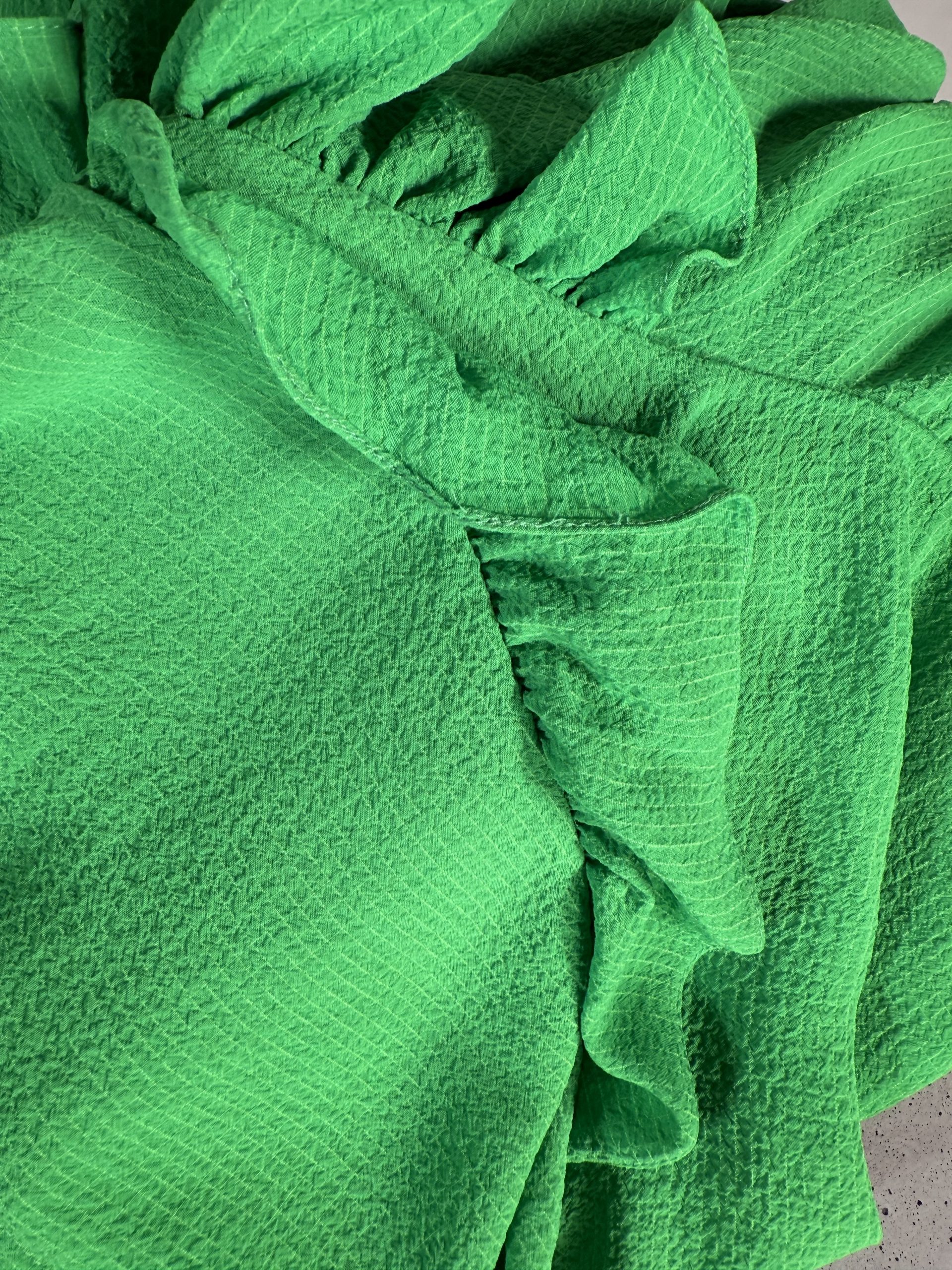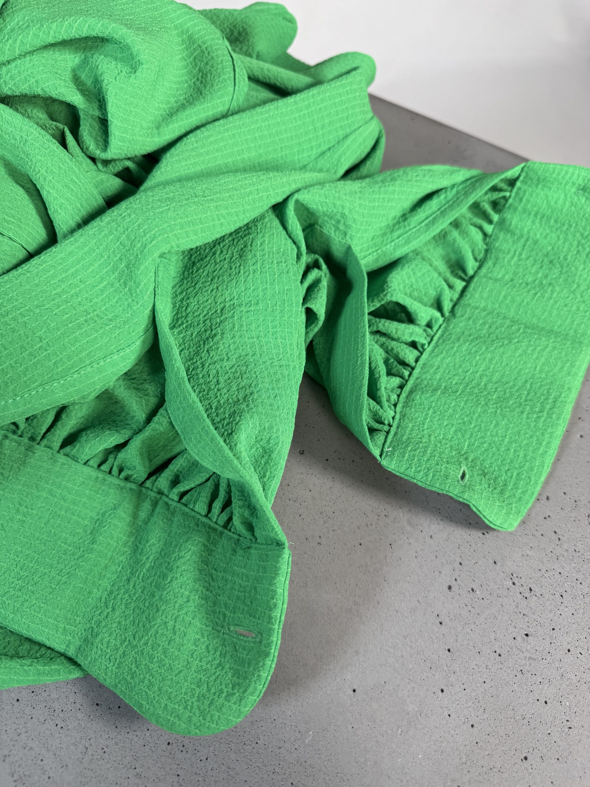 This blouse by Pring by Thornton Bregazzi is the epitome of femininity and romantic chic. Cascading ruffles along the shoulders create a graceful trapeze silhouette that flows softly to the hips, while voluminous sleeves gathered neatly at the cuffs lend an airy, elegant touch.